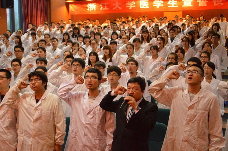宣誓仪式由2012级辅导员吴行主持,“广行济世仁者爱人”,代表学院欢迎全体2012级医学生们,并指出大家即将踏上的是一条通往生命尊严与生命关爱的人性光辉之路。随后,2012级的医学生们一同穿上白大褂,举起右手,在叶旭军老师的带领下庄严宣誓。“健康所系,性命相托”,每位医学生脸上都呈现出严肃的神情,许下自己“决心竭尽全力除人类之病痛,助健康之完美,维护医术的圣洁和荣誉”的诺言。窗外飘着盈盈细雨,医学生们的坚定的信念响彻整个医学院。